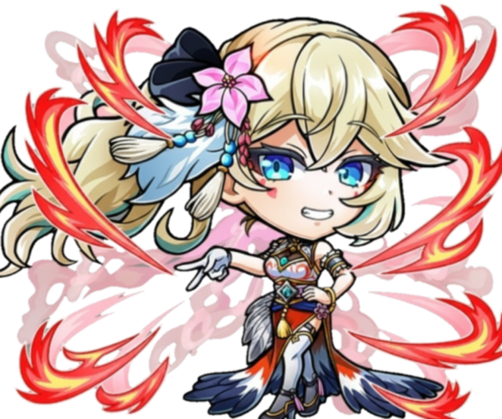 (1) 手札の味方全員に2ターンの間、ATK2段階バフを付与+火属性天属性の味方にATK1段階バフを付与+妖種族の味方にATK1段階バフを付与+敵単体に2ターンの間、DEF3段階デバフを付与+敵単体に(0.9×6)倍の火属性攻撃